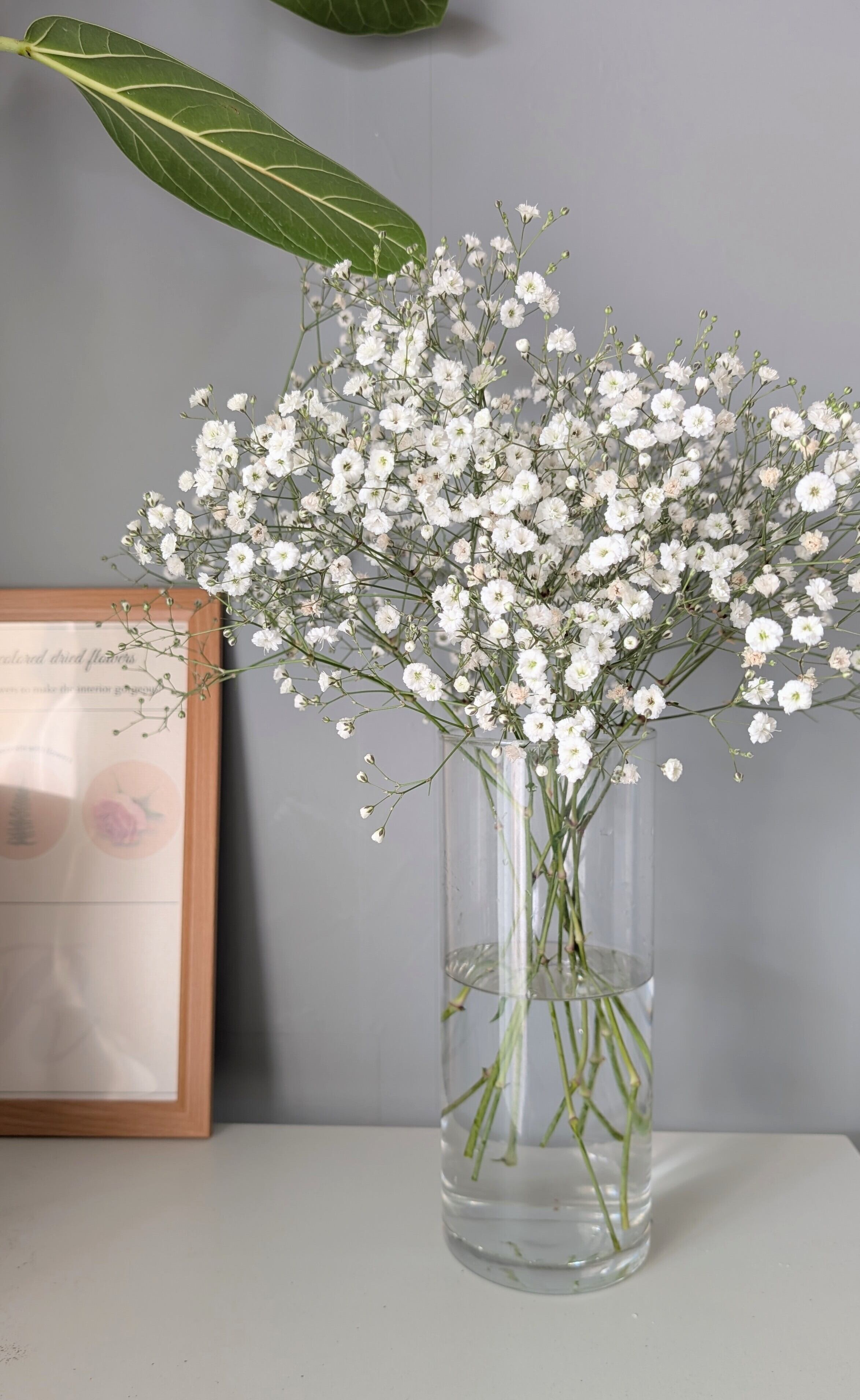 ガラスの器や壁に吊るしたかすみ草は、どんな空間にも溶け込み、時間とともにさらに魅力的な雰囲気を作り出します。