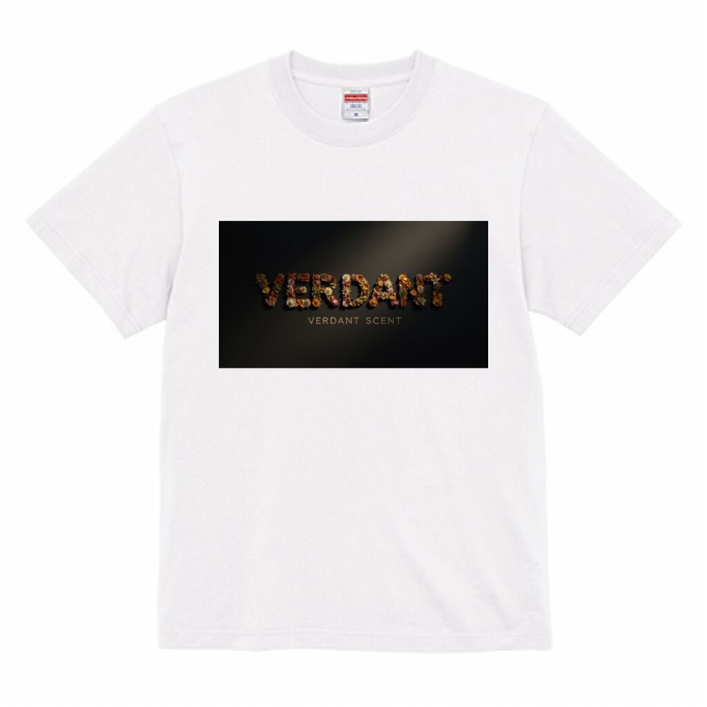 花文字でアレンジしたデザインロゴ。「verdant scent」 シックなフラワーアレンジのTシャツ ブラック・フラワー
