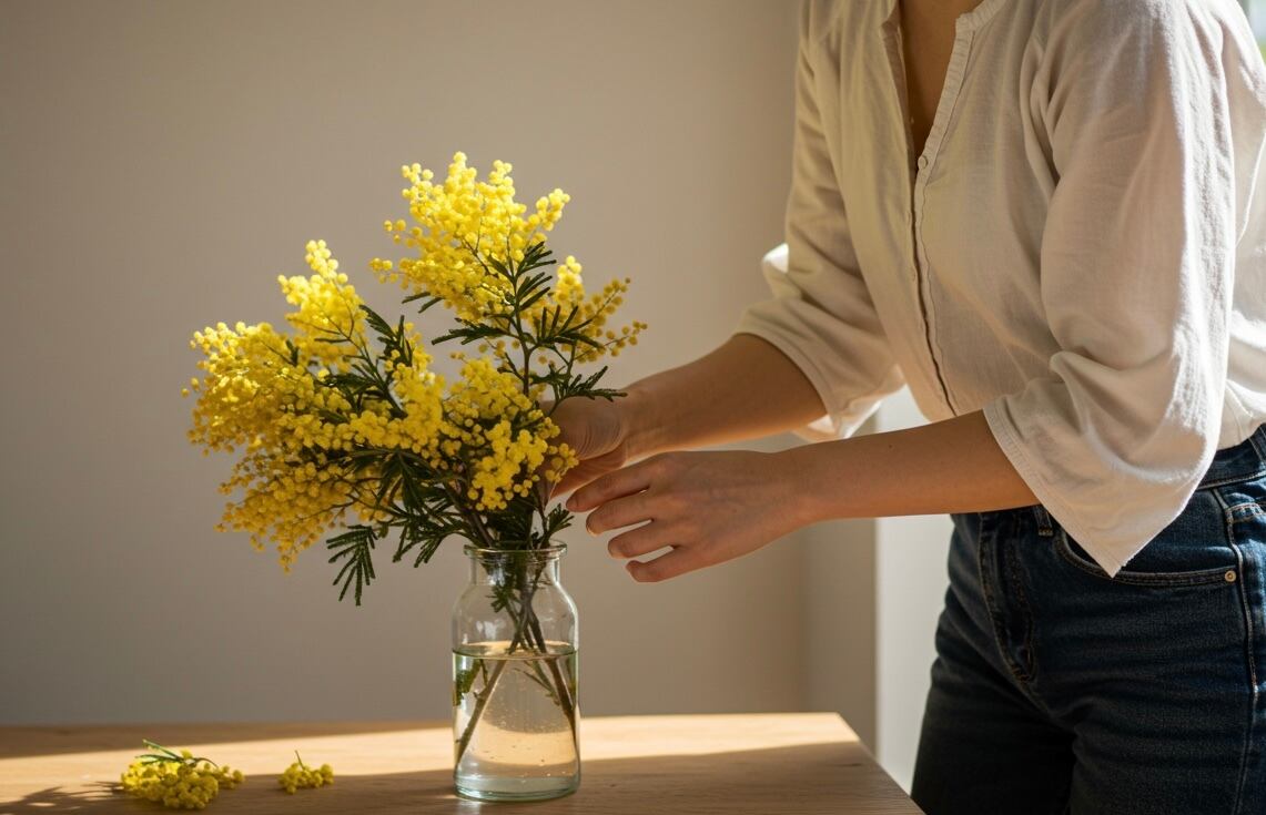 ミモザの優雅な姿は、リビングやエントランスのインテリアを華やかに演出します。