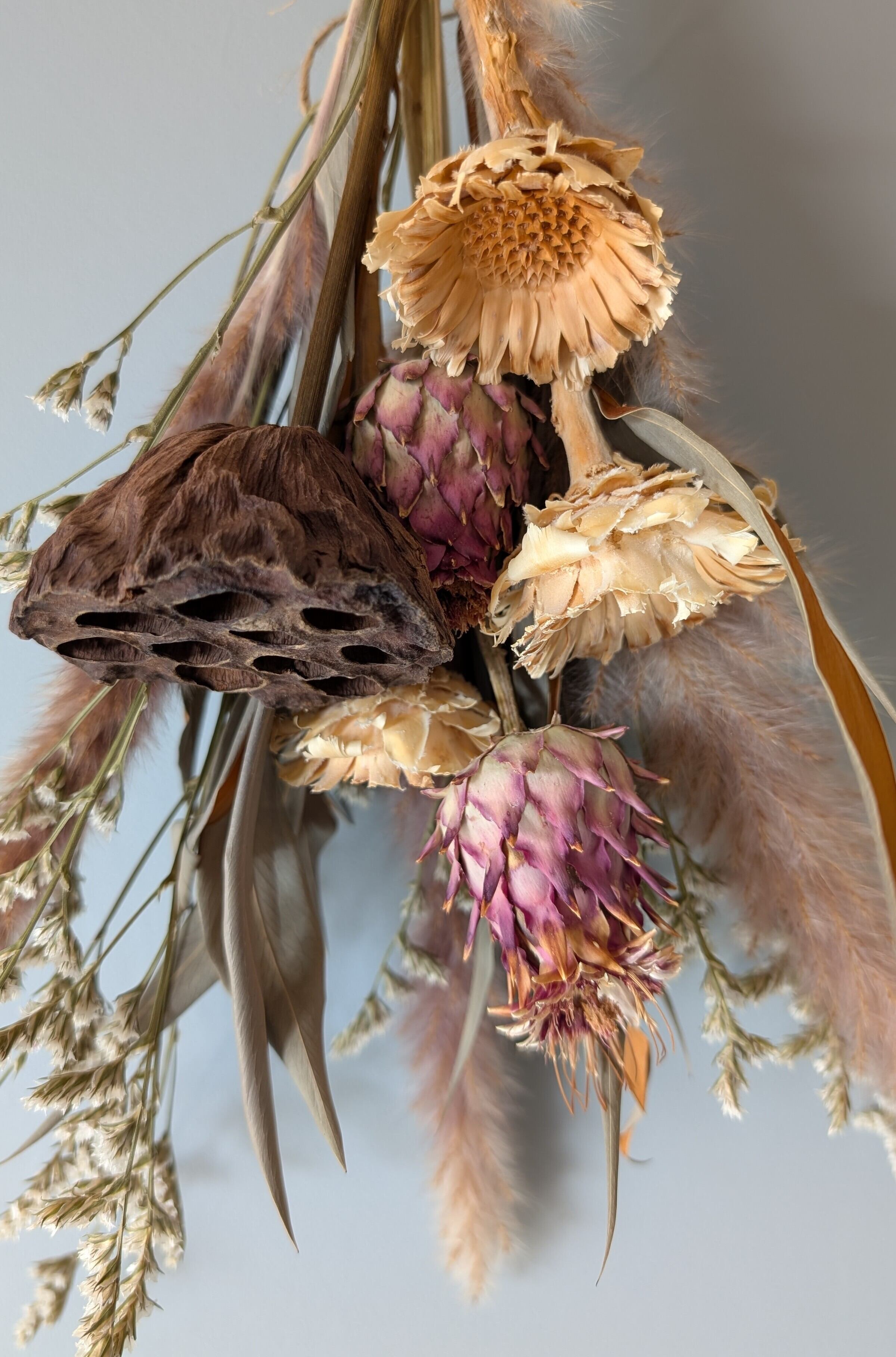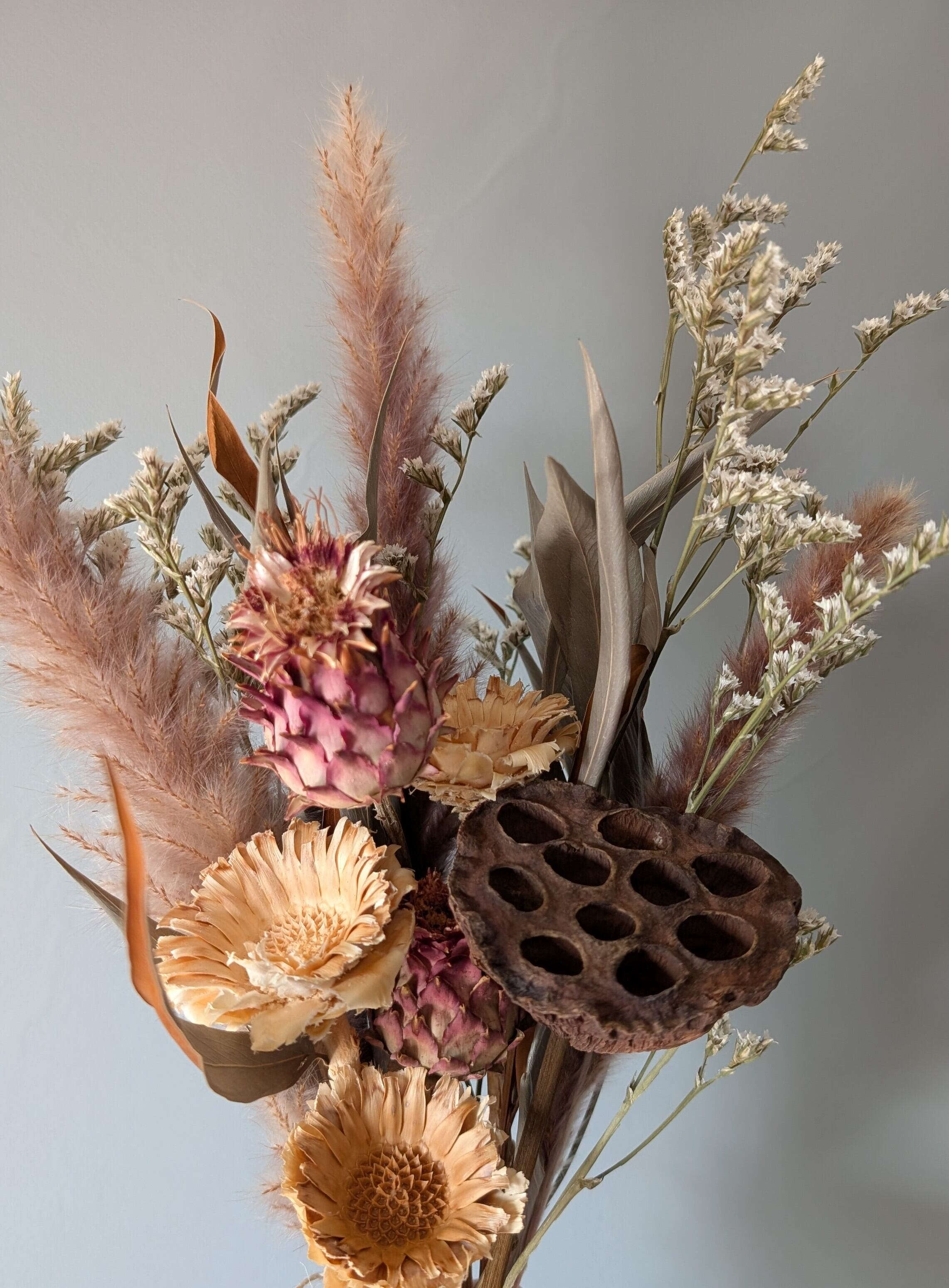 「蓮のドライフラワーとアーティーチョーク、パンパスグラスのスワッグ」