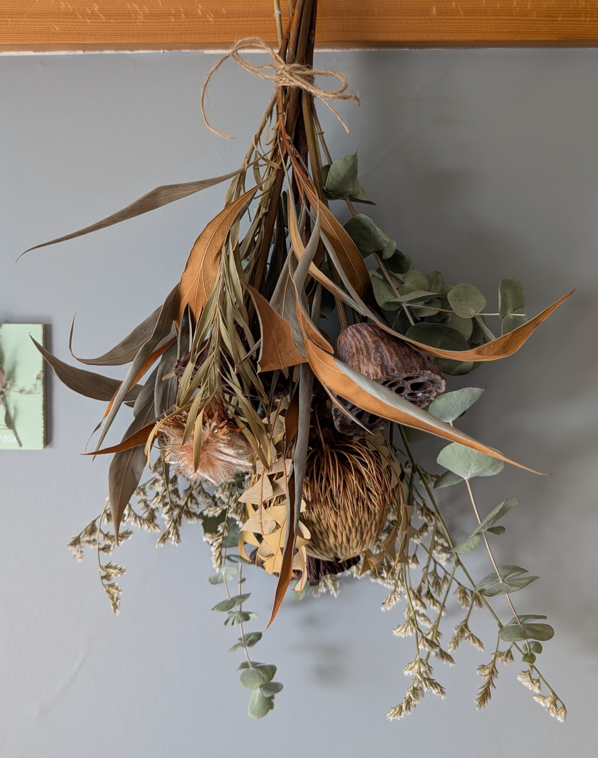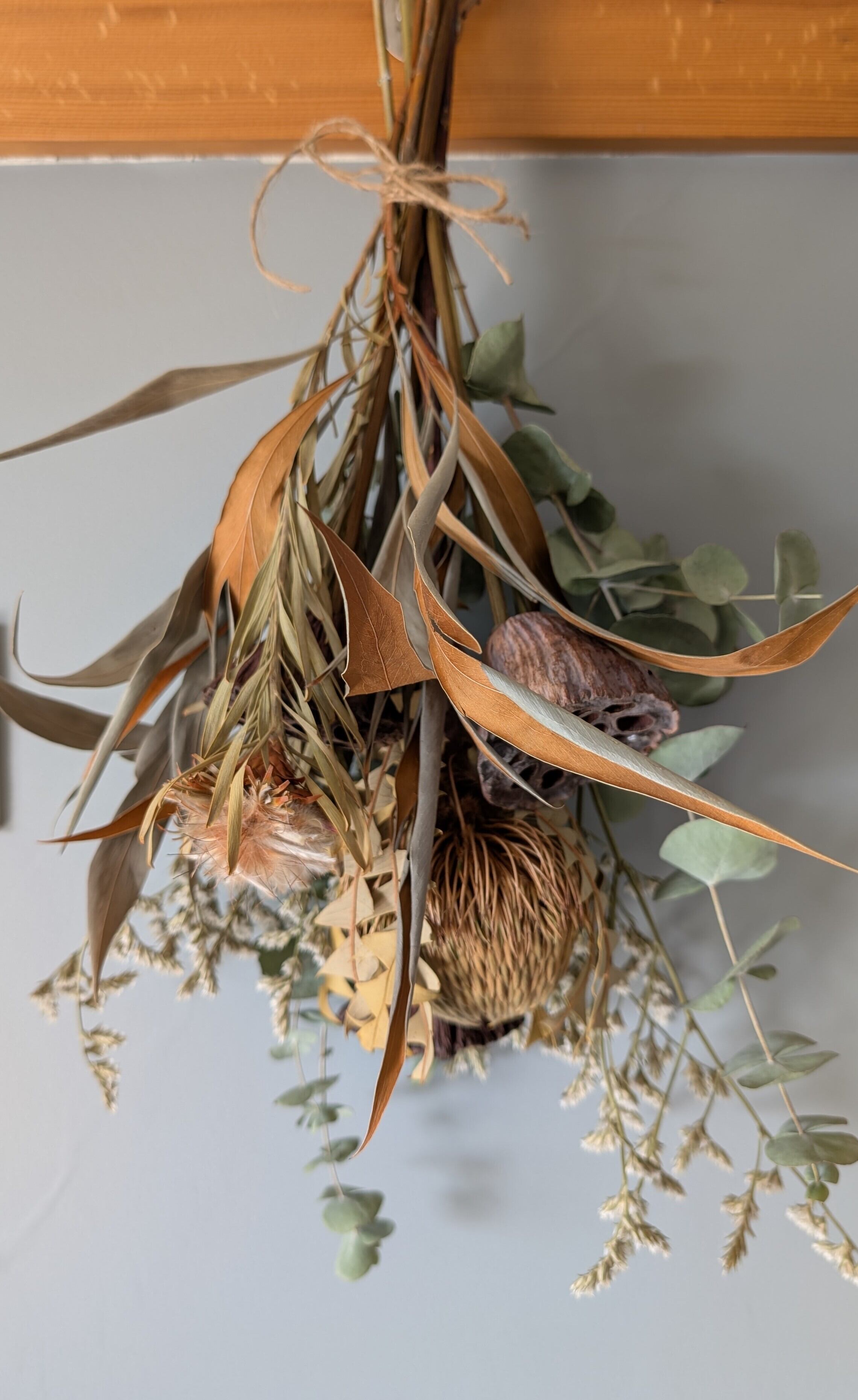 「プロテア×蓮×ユーカリ×グレビレアゴールド 大胆に魅せるスワッグ」