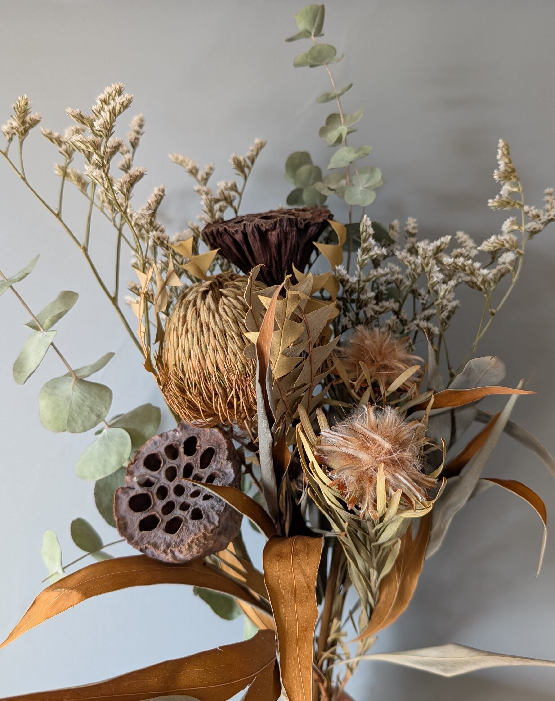 個性的で力強いプロテアをメインに、静かに趣を添える蓮のドライ、